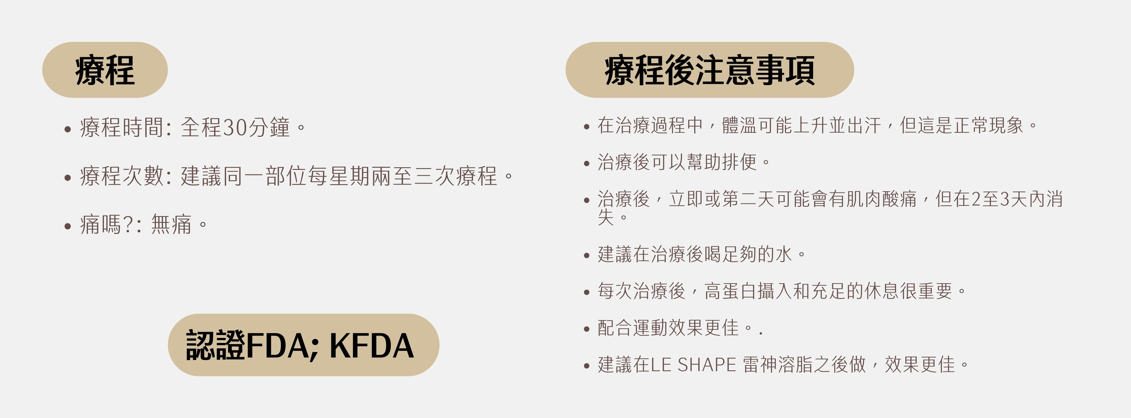 建議同一部位每星期兩至三次療程/每次治療後,高蛋白攝入和充足的休息很重要/配合運動效果更佳。/建議在Le Shape 雷神溶脂之後做,效果更佳。