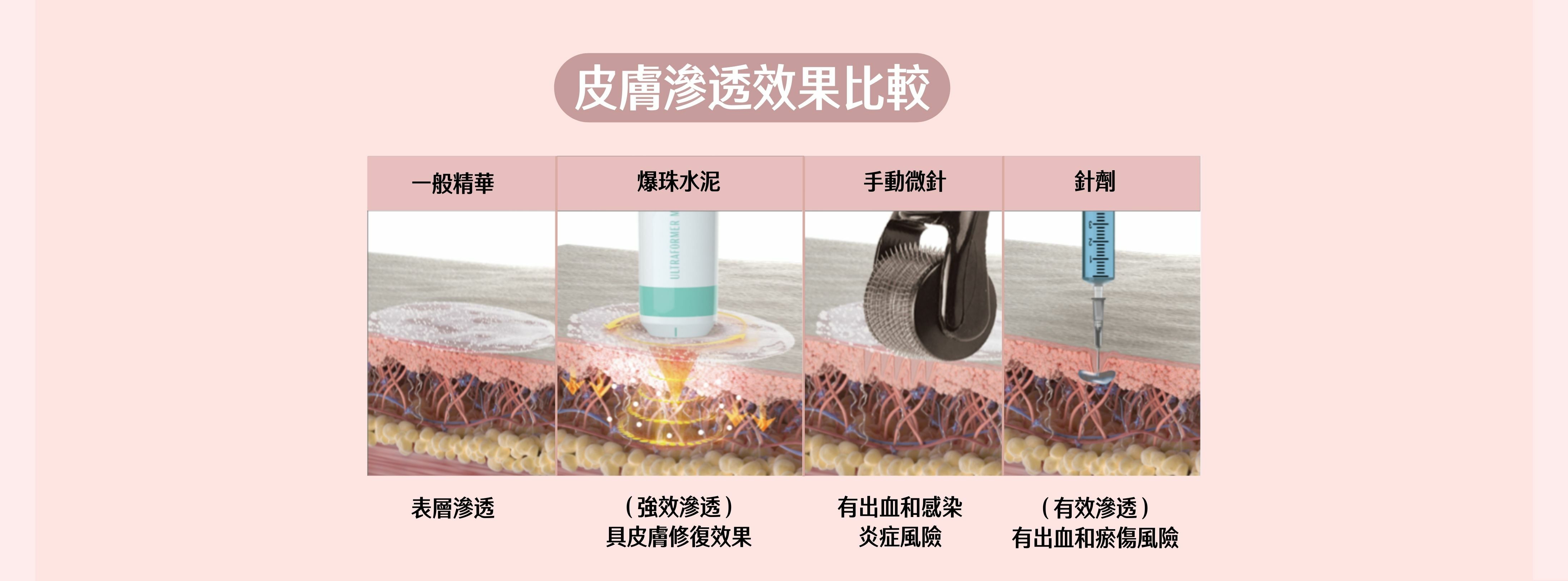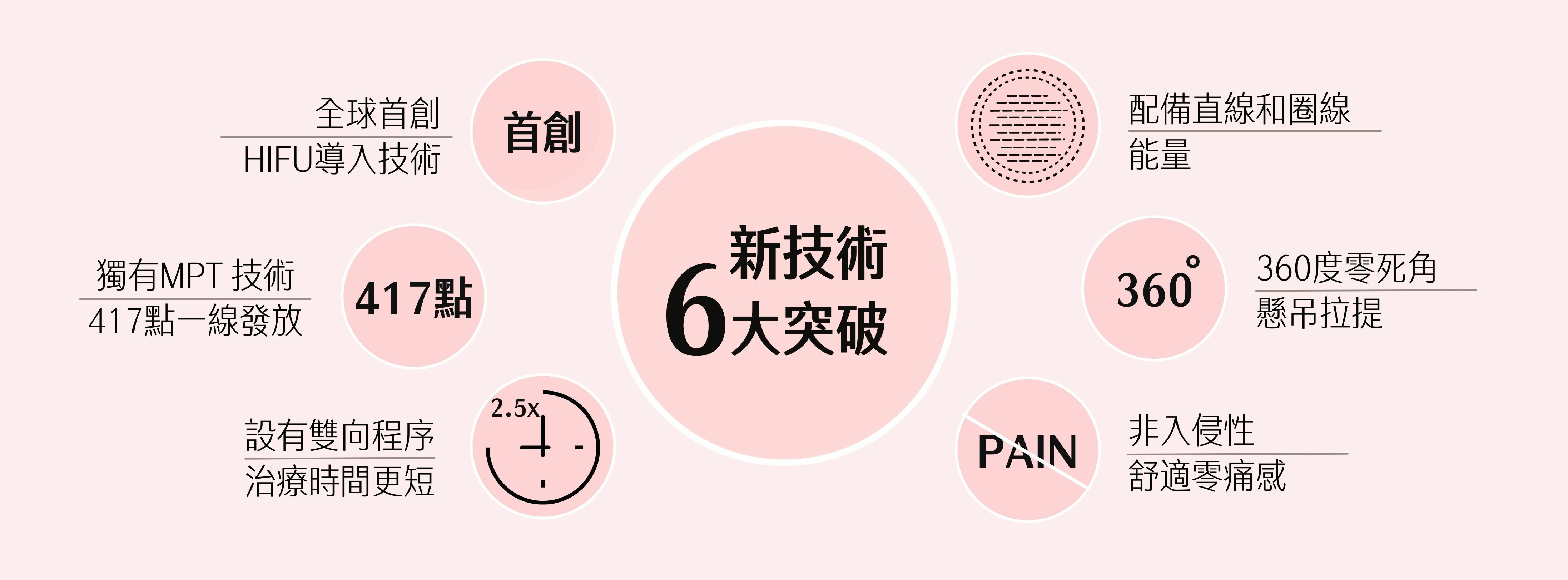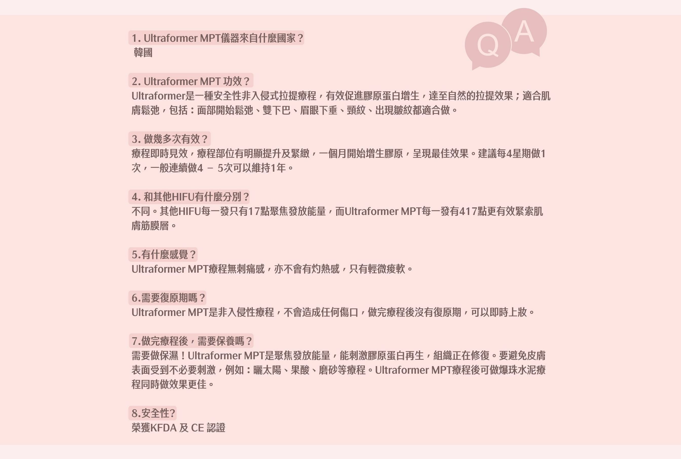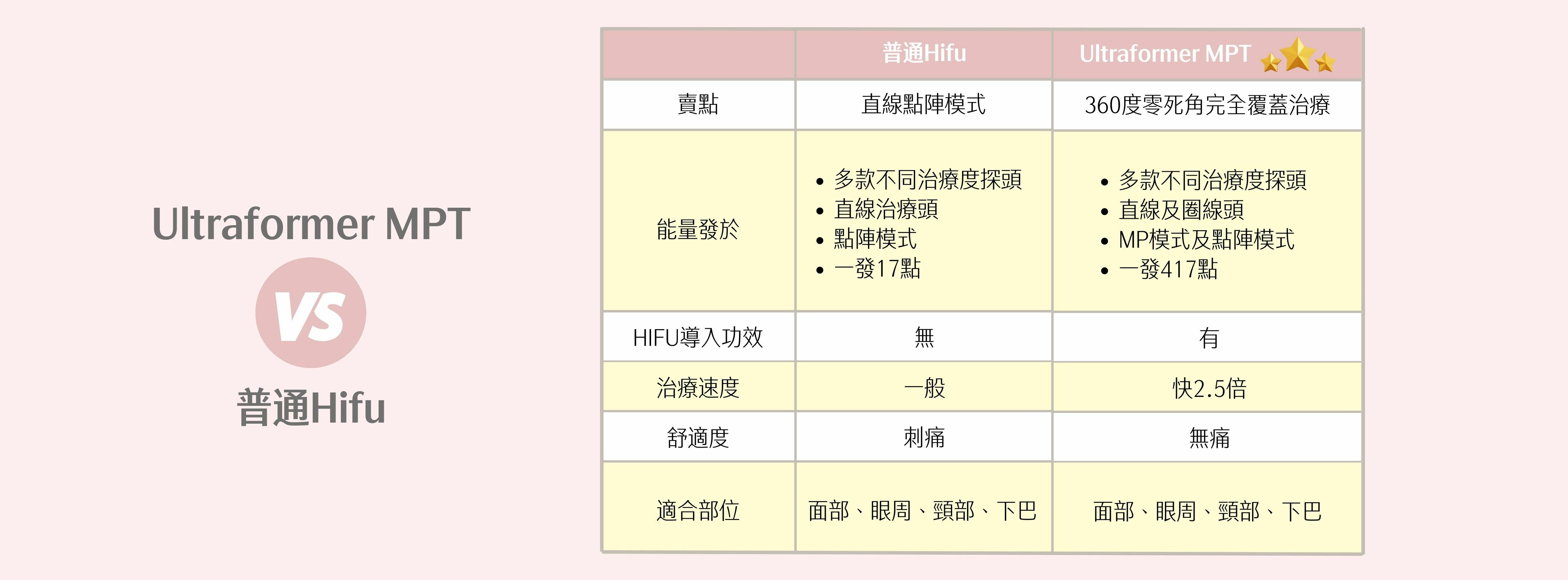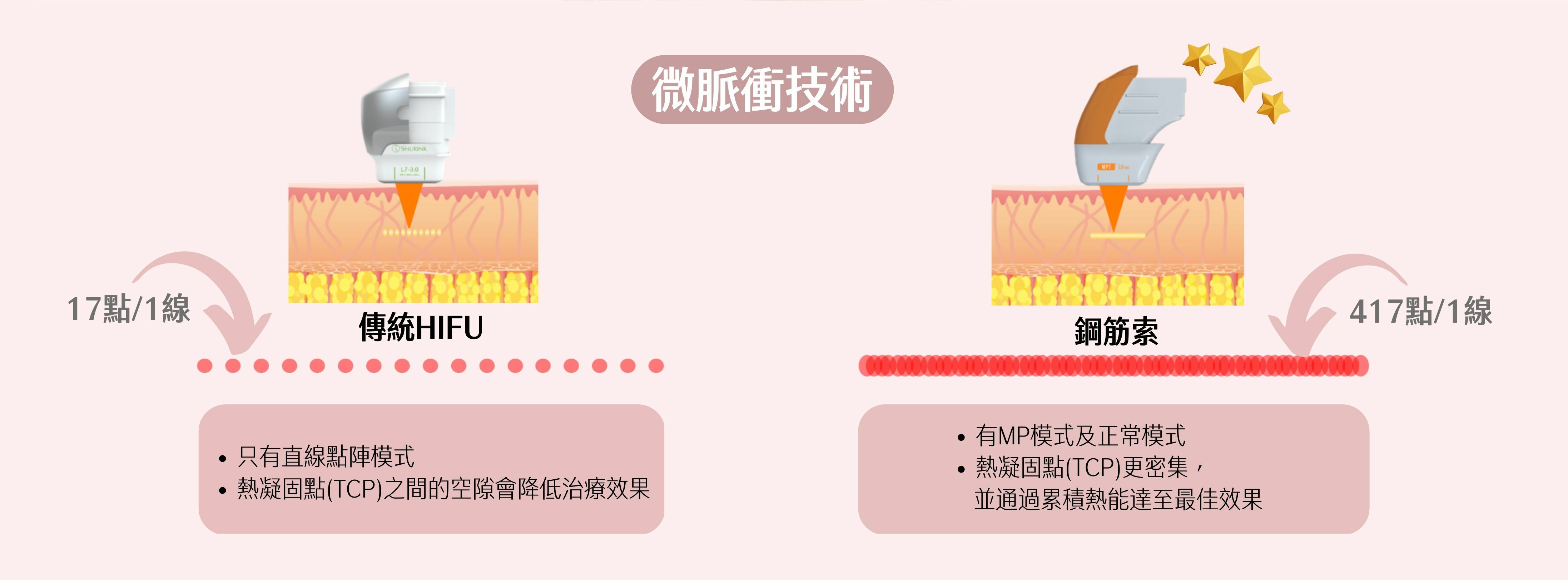 不同。其他HIFU每一發只有17點聚焦發放能量,而Ultraformer MPT每一發有417點更有效緊索肌膚筋膜層。