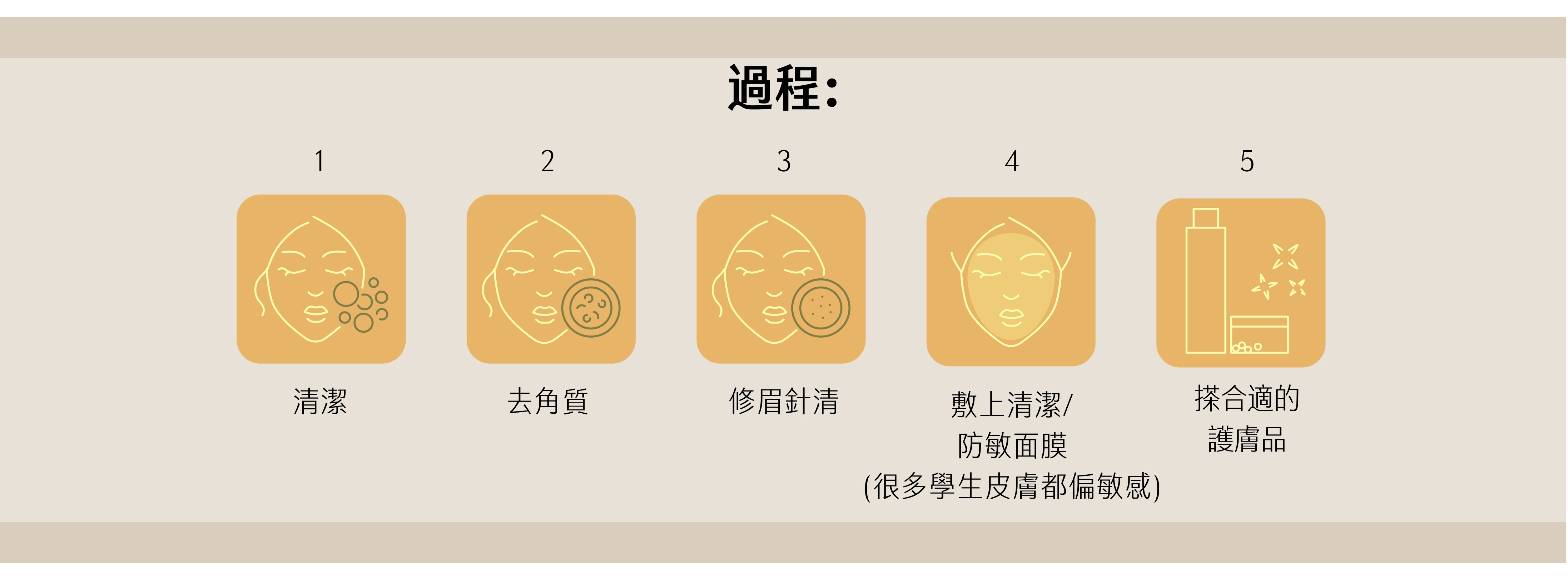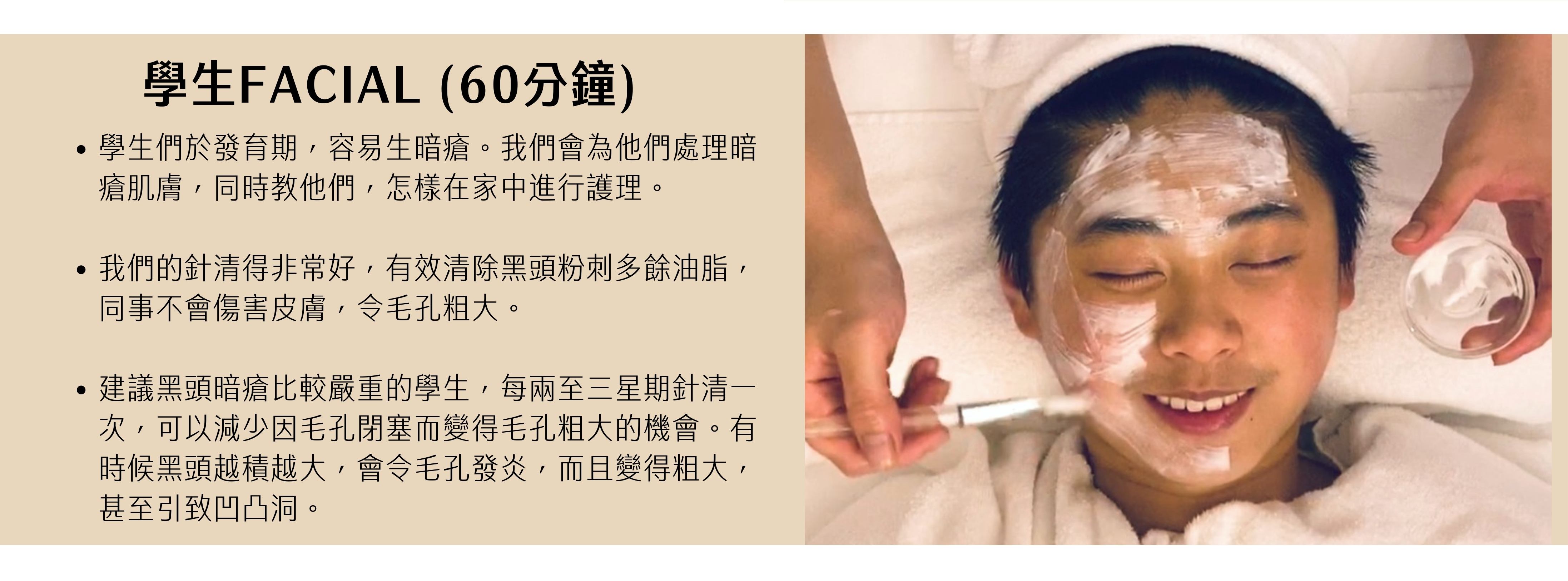進行不刺激皮膚的深層清潔/為學生用針清黑頭粉刺/教學生怎樣在家中進行皮膚護理/建議黑頭暗瘡比較嚴重的學生每兩至三星期針清一次/可以減少因毛孔閉塞而變得毛孔粗大的機會黑頭越積越大,會令毛孔發炎,甚至引致凹凸洞